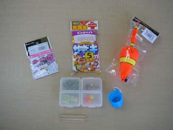 | サビキ釣り道具一式(左)とウキ釣り道具一式(右)です。サビキ釣りは、ウキ仕掛けで遠くへ投げることができます。ウキをはずしてウキなしで足元で釣る釣り方も可能です。 |
